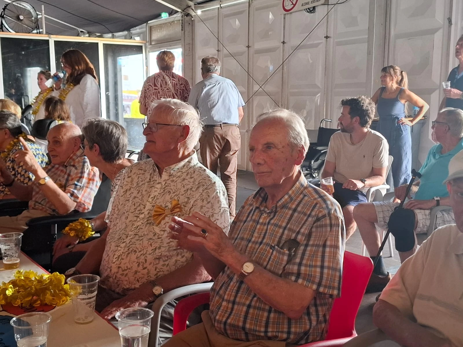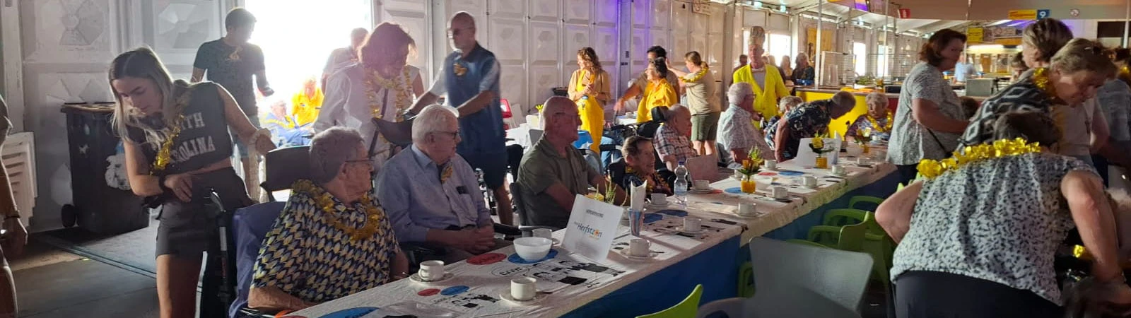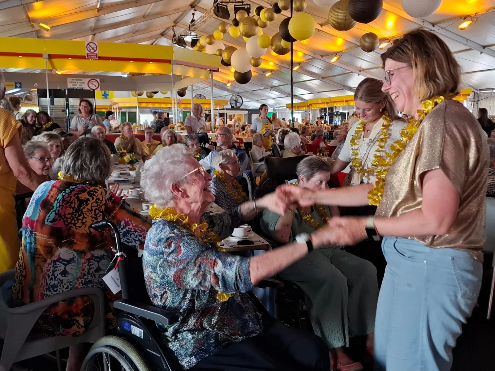 Maar liefst vijfentwintig bewoners en net zo veel vrijwilligers waren van de partij op de seniorenmiddag in de Schoolfeesttent. Iedereen genoot van de muziek, een drankje en een hapje. Veel dank aan onze vrijwilligers en zorgmedewerkers, die graag mee gingen!
