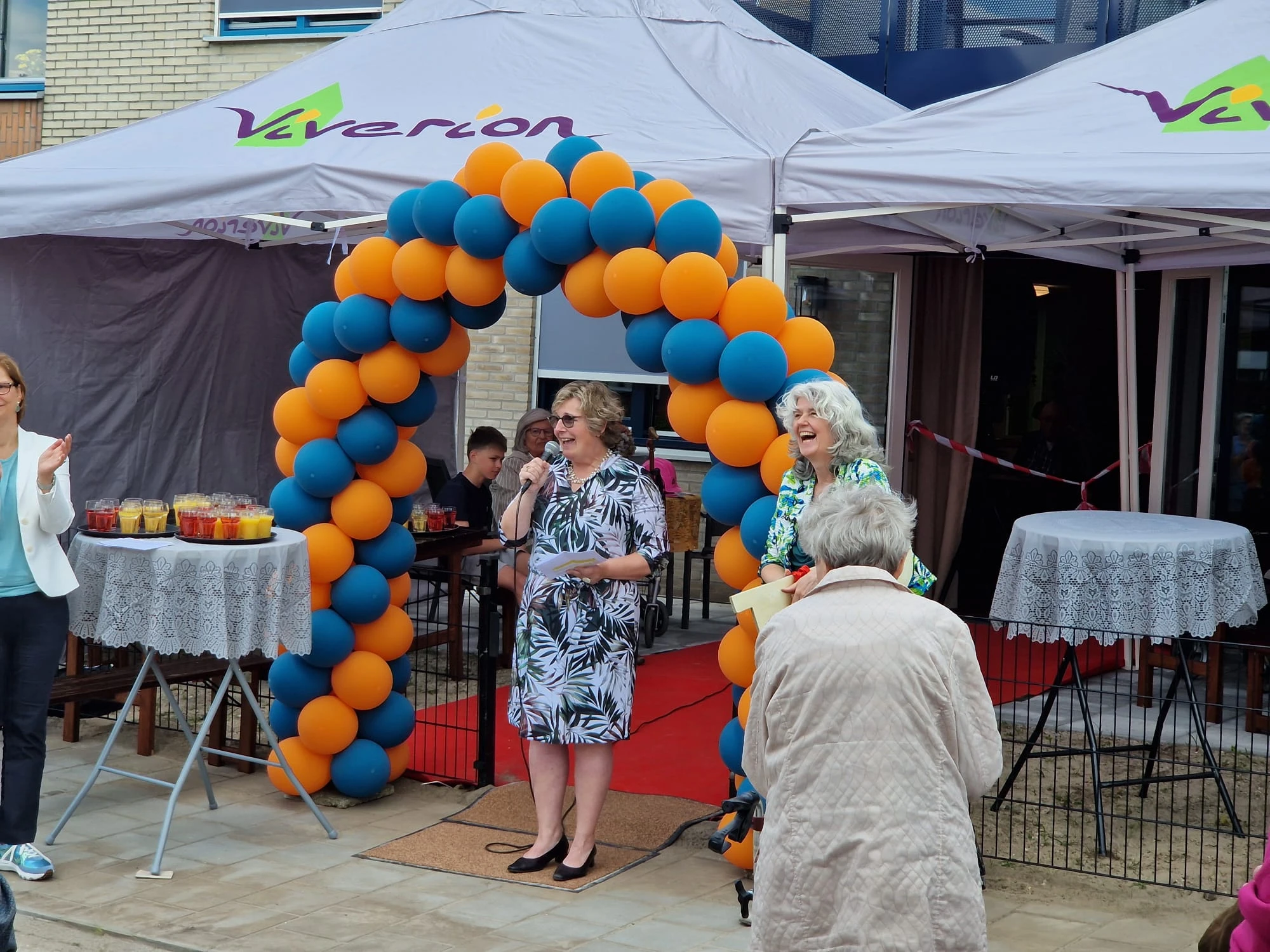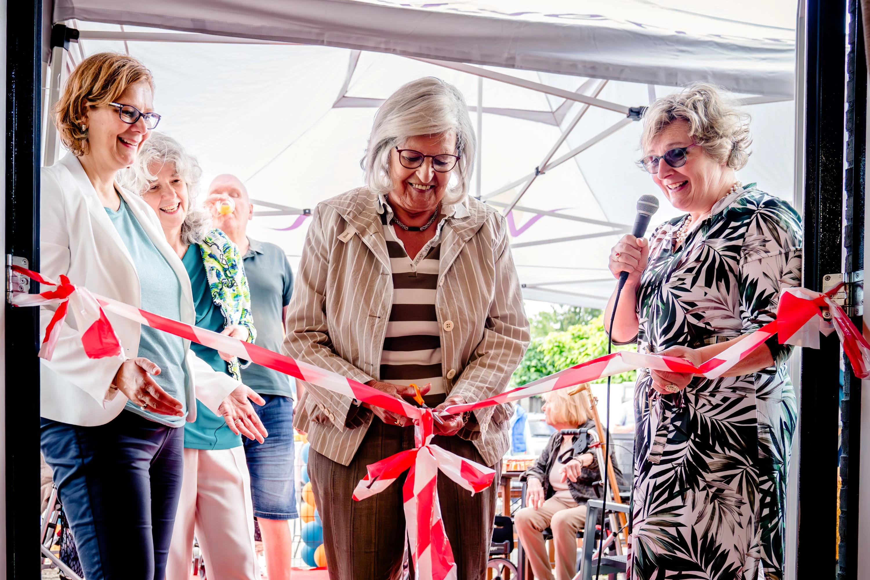Stella Broeks, vanuit De Warme Huizen onder meer verantwoordelijk voor het hele (ver)bouwproject, bedankt in haar speech iedereen die het nieuwe Kapellengaarden mogelijk heeft gemaakt. ‘De medewerkers van het aannemersbedrijf dachten continu mee over de veiligheid en over de communicatie met onze bewoners en medewerkers. Petje af, of liever gezegd: bouwhelm af!’ Ze benadrukt dat de zorg en andere activiteiten tijdens de bouw gewoon doorgingen. ‘Dat betekende vele extra meters voor onze zorgmedewerkers. Nu zijn we letterlijk wel klaar met die rood-witte linten. Het wordt tijd om er een door te knippen en daarmee de bouwperiode achter ons te laten!’