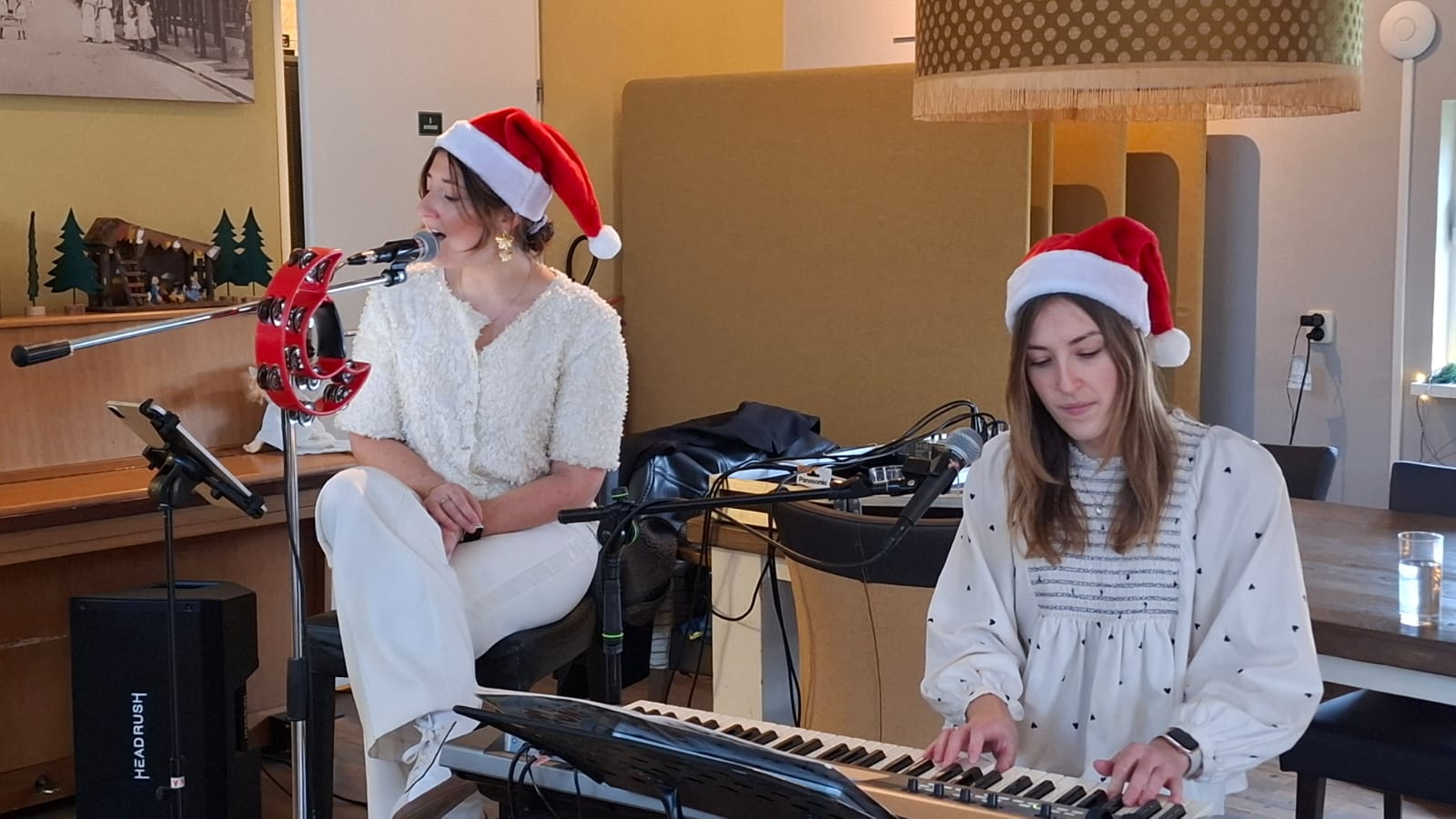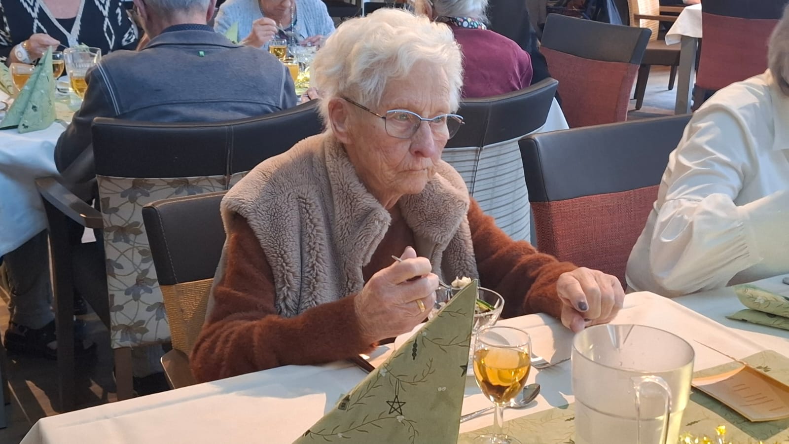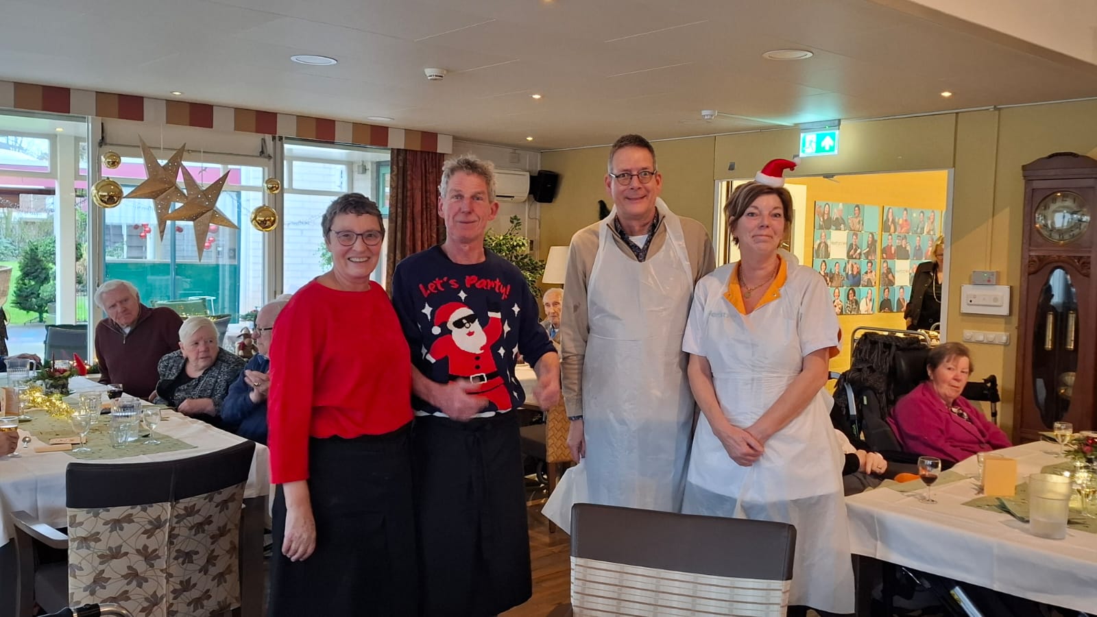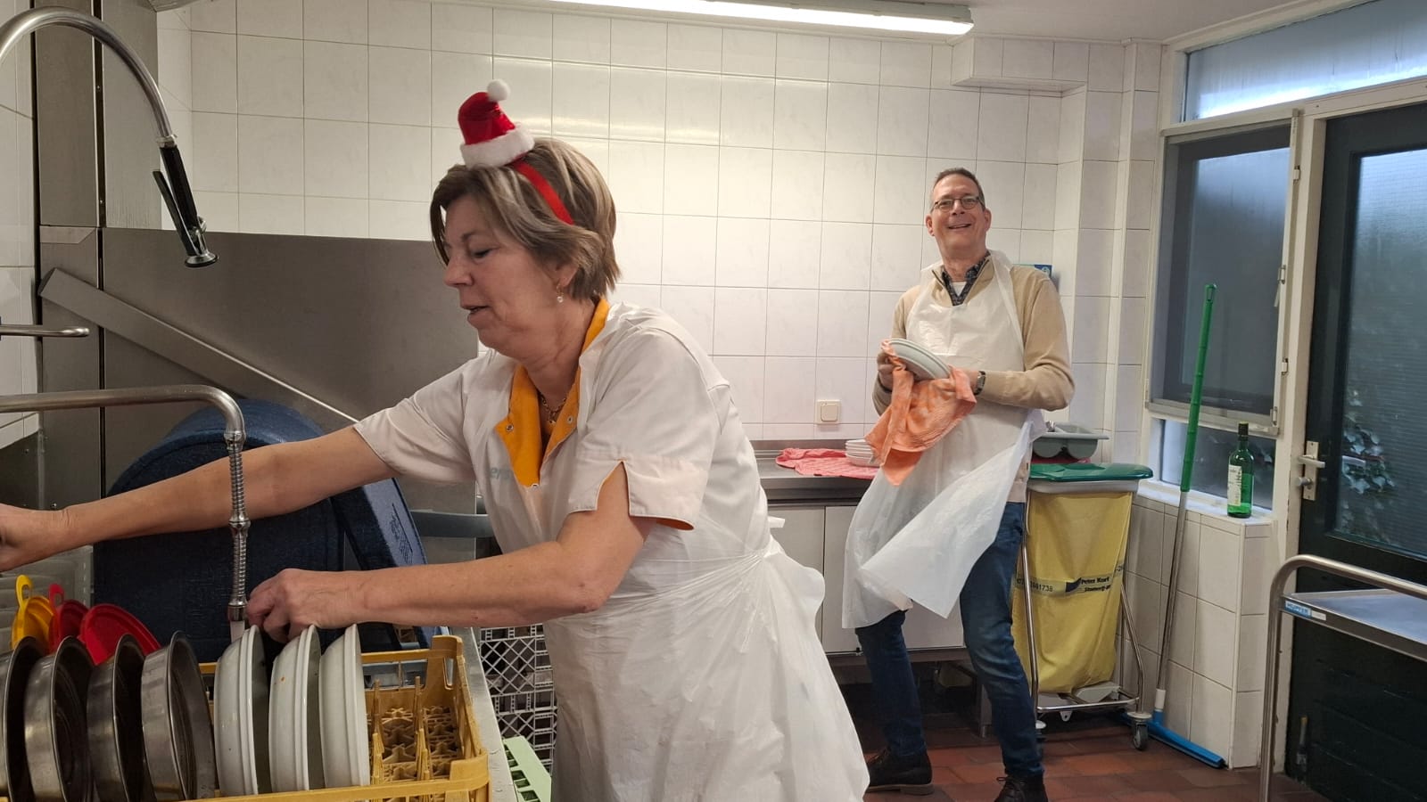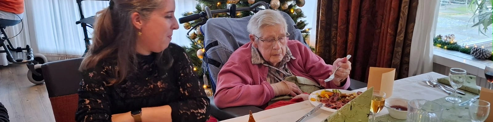 Woensdagmiddag 23 december ging iedereen aan tafel voor het traditionele kerstdiner bij Huize Herfstzon. Onze bewoners genoten van de heerlijke maaltijd en de sfeervolle muziek van Susan en Manon. De afwas moest natuurlijk ook gedaan worden... Yvonne werd bijgestaan door Frans.