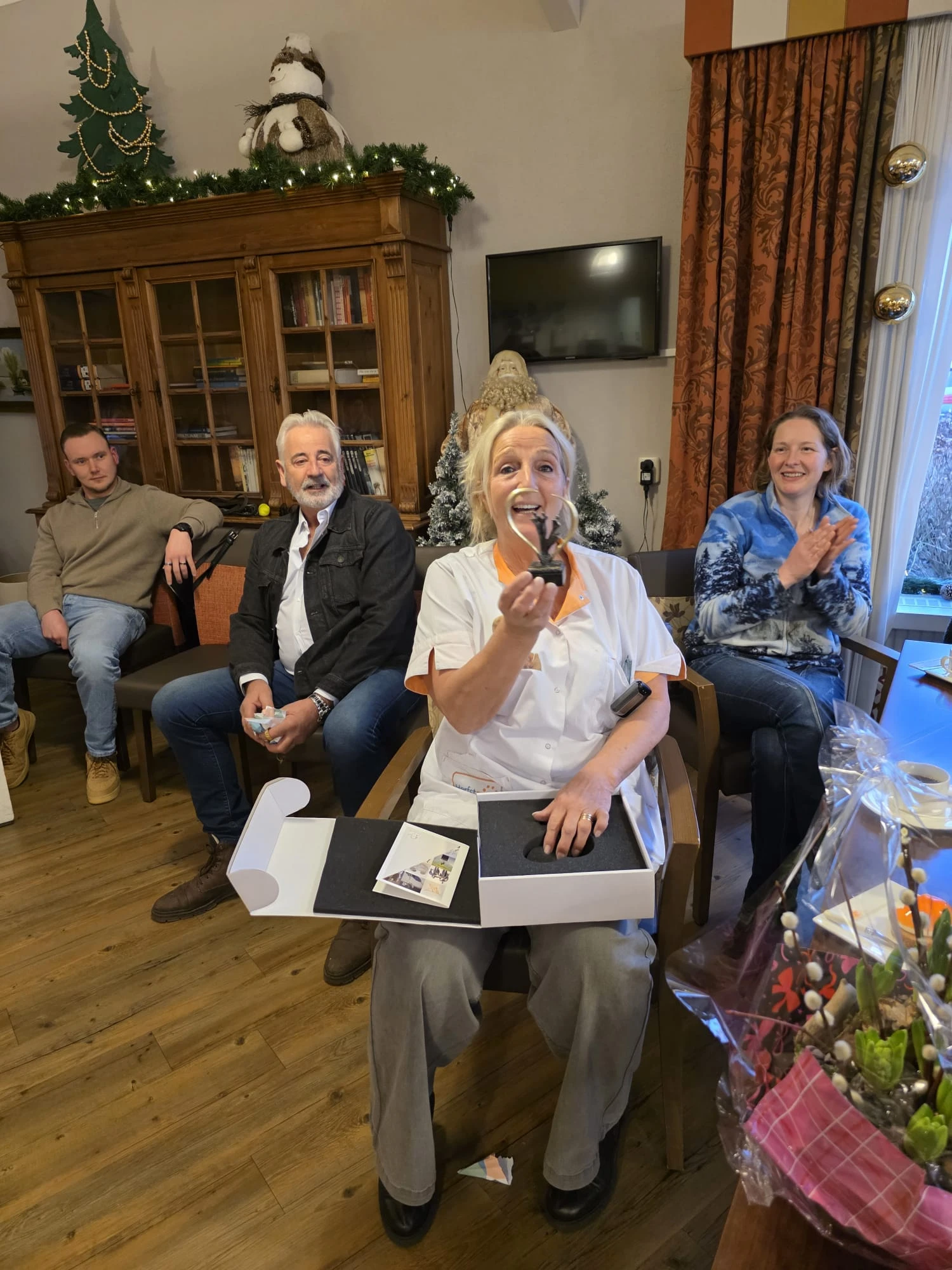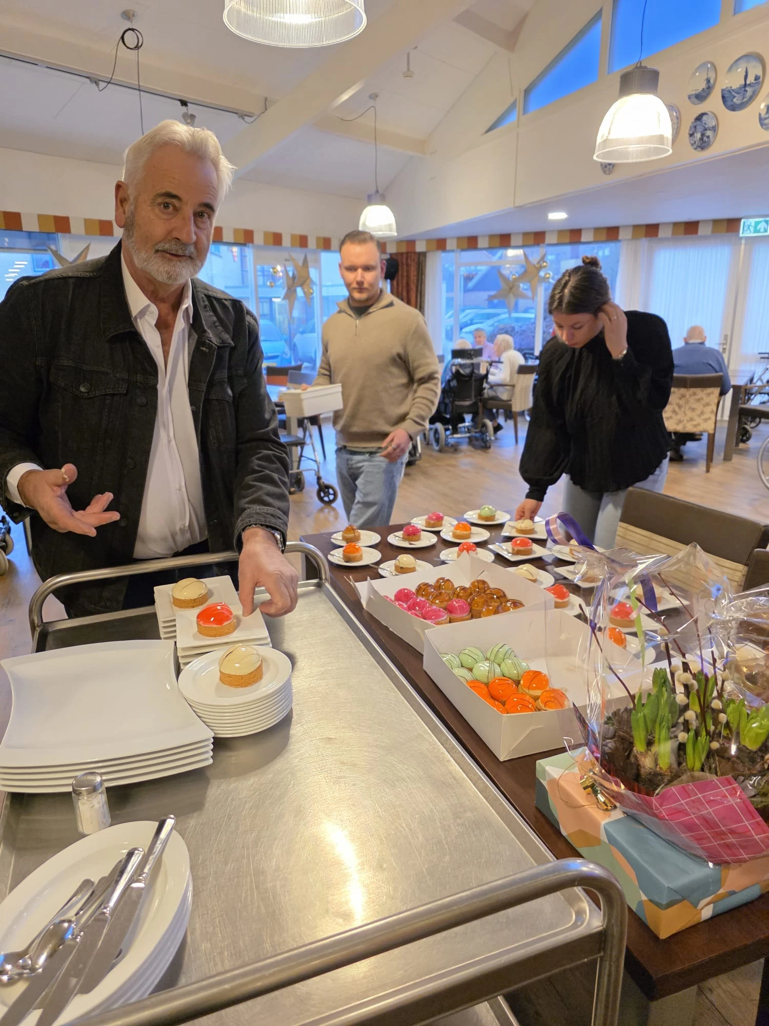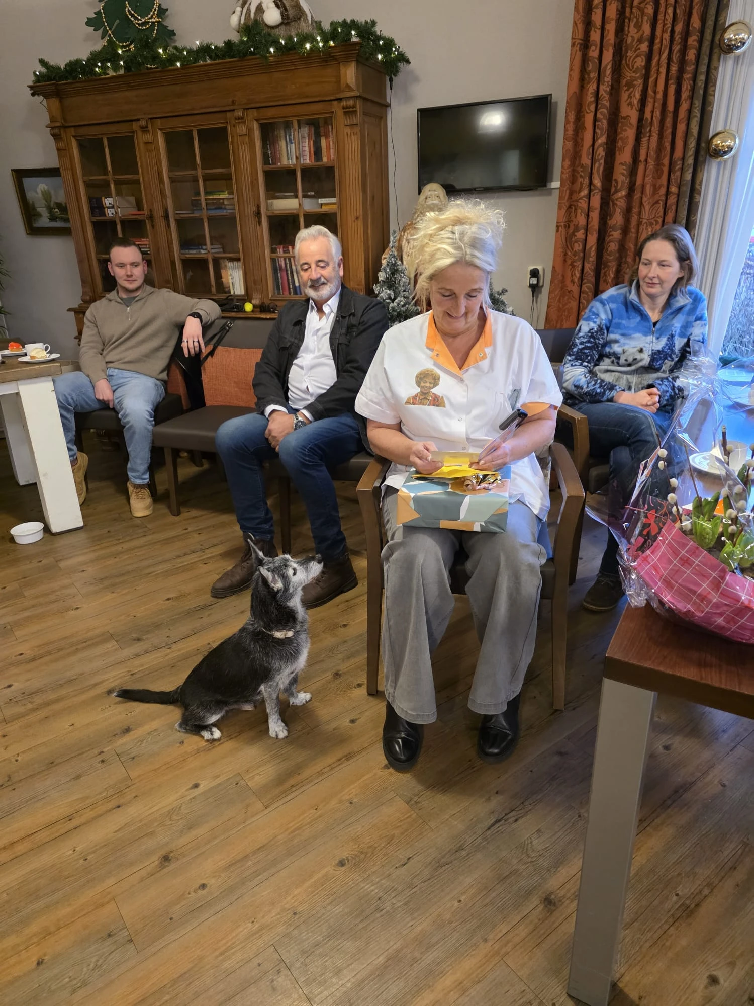 We stonden uitgebreid stil bij dit jubileum. Tineke werd om zeven uur 's morgens door de collega's opgevangen met een speciaal ontbijt en een uniform met opdruk. Om tien uur hebben we samen met haar familie, bewoners en collega's koffie gedronken. Toen was het tijd voor de cadeautjes en warme toespraken. Binnenkort volgt nog een groot feest om het veertigjarig dienstverband te vieren! Gelukkig blijft Tineke nog wel gewoon bij ons werken, ze vindt het nog altijd leuk.